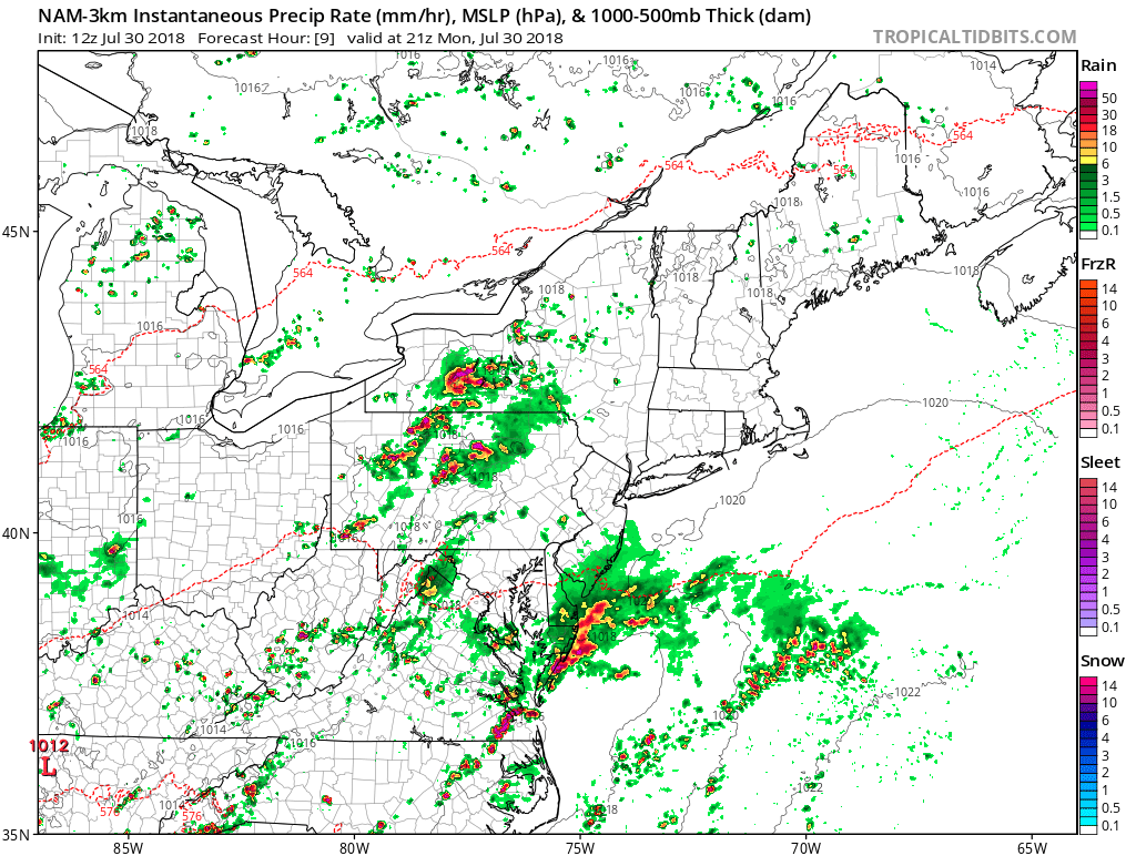 NAM model showing showers and t-storms arriving from the southwest over the Northern Mid-Atlantic region early this evening