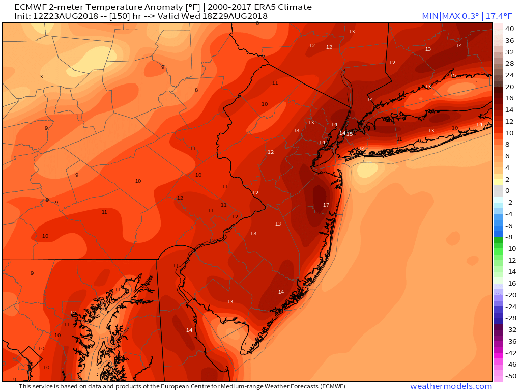Temperatures today in the Northeast will average several degrees below normal. It will still reach into the lower 80’s in the New York City area, but with dew points so much lower than they have been over the past several weeks, the airmass will continue to feel downright refreshing. No risk of showers today, only a few fair weather clouds are anticipated. It’s about as close to a 10/10 day as you can get in August.