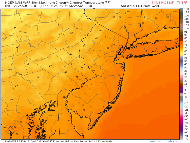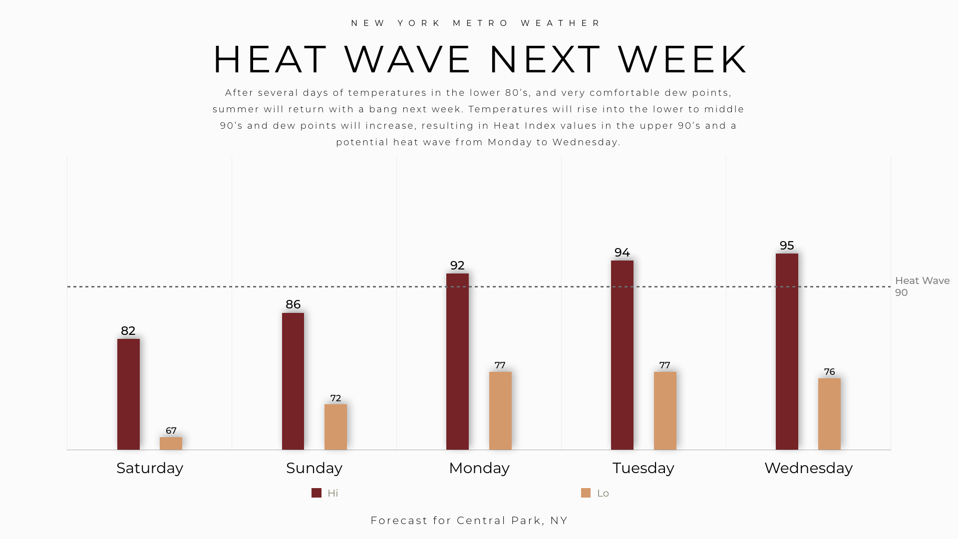As ridging builds in the atmosphere, southerly winds will replace the cooler northerly wind component. This will draw in warmer, more humid air. You’ll start to feel this as early as Sunday, when temperatures warm a few degrees and the relative humidity values increase, owing to higher dew points. The real change will come on Monday in the Northeast states, when temperatures reach the upper 80’s to lower 90’s and Heat Index values approach the middle 90’s in the NYC Metro Area.