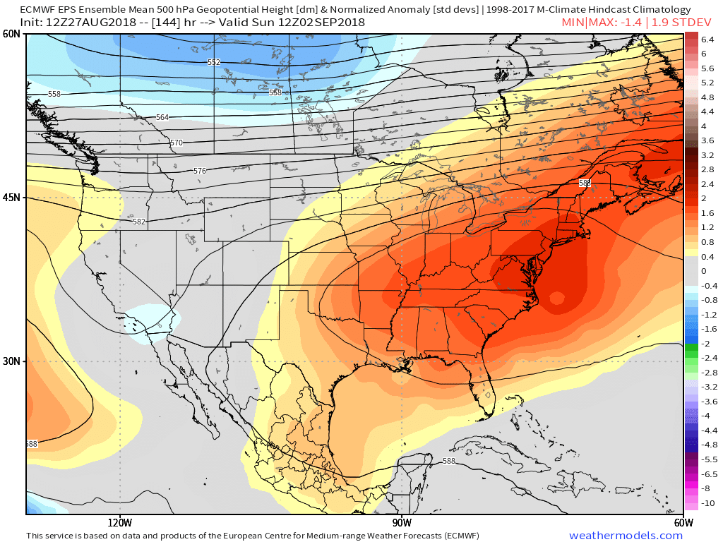 After the brief hiatus, heat returns with a vengeance next week. Forecast models are in great agreement that a large ridge will expand again across the Eastern United States. This will lead to increasingly noticeable southerly winds, rising humidity and – you guessed it – anomalous warmth. Temperatures again look to average well above normal starting on Tuesday.