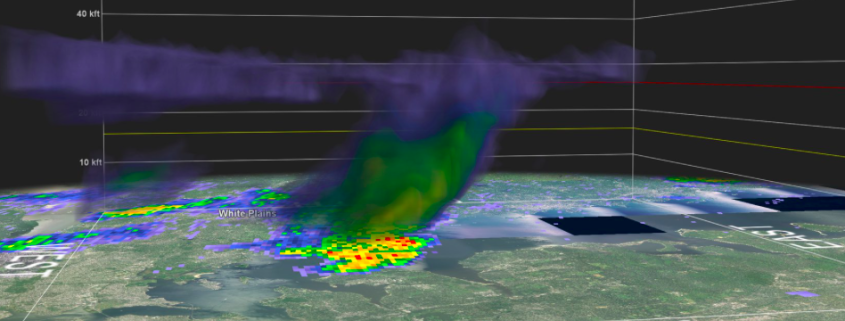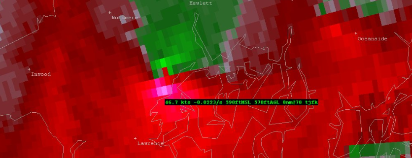 Also notable was a brief area of rotation in one of the stronger storms over Queens and Nassau counties. If you weren’t paying close attention, you may have missed it. In fact, even using Doppler radar out of Upton, NY (KOKX) or Mount Holly, NJ (KDIX) wouldn’t necessarily have keyed you in to the rotation. But a zoom into Terminal Doppler Radar Data (TDWR) out of JFK Airport revealed something more interesting.