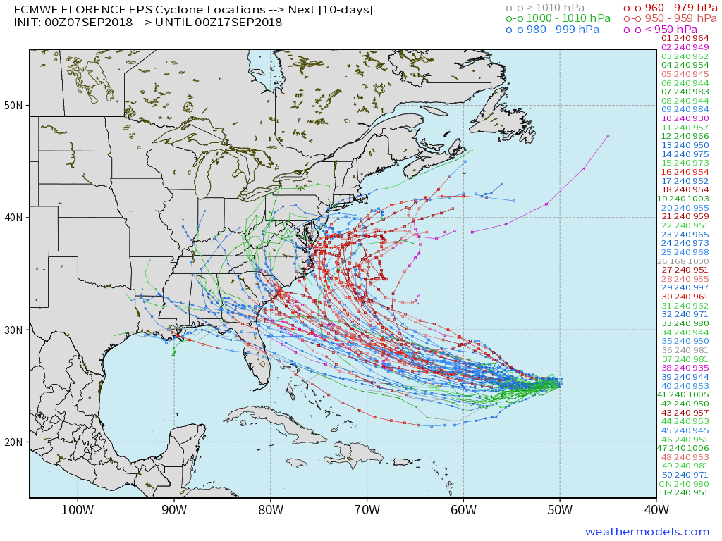 The latest Euro Ensembles showing a varying set of tracks for Florence – most of which impact the Eastern US in some form.