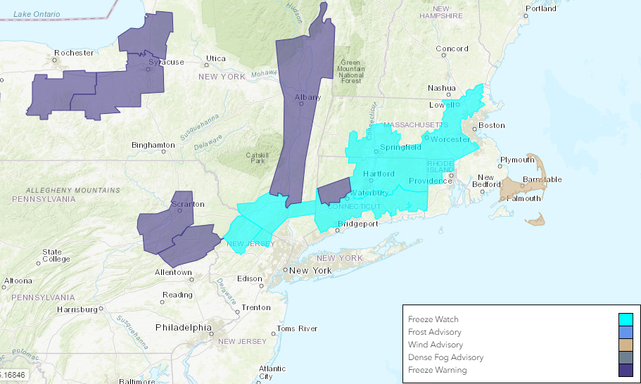 The National Weather Service has issued Freeze Watches and Warnings for interior parts of the Northeast tonight.
