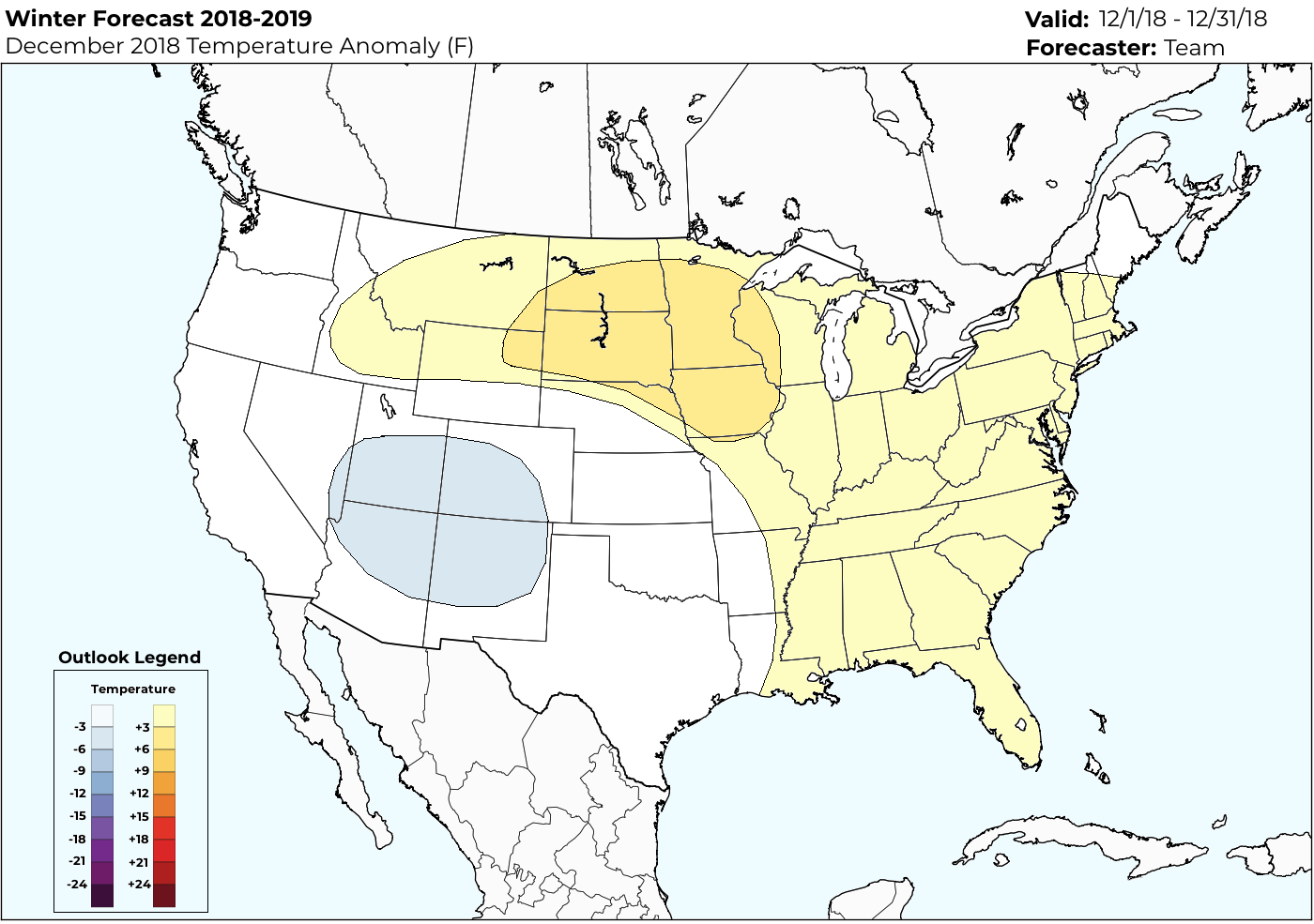 Warmth is expected across the Northern Plains states, where temperatures may be particularly anomalous from the Dakotas into Minnesota and parts of Iowa. Snowfall is expected to average below normal across these regions to start the winter. Some cooler weather may occur across the Four Corners region into parts of Texas as troughing establishes itself across this area.