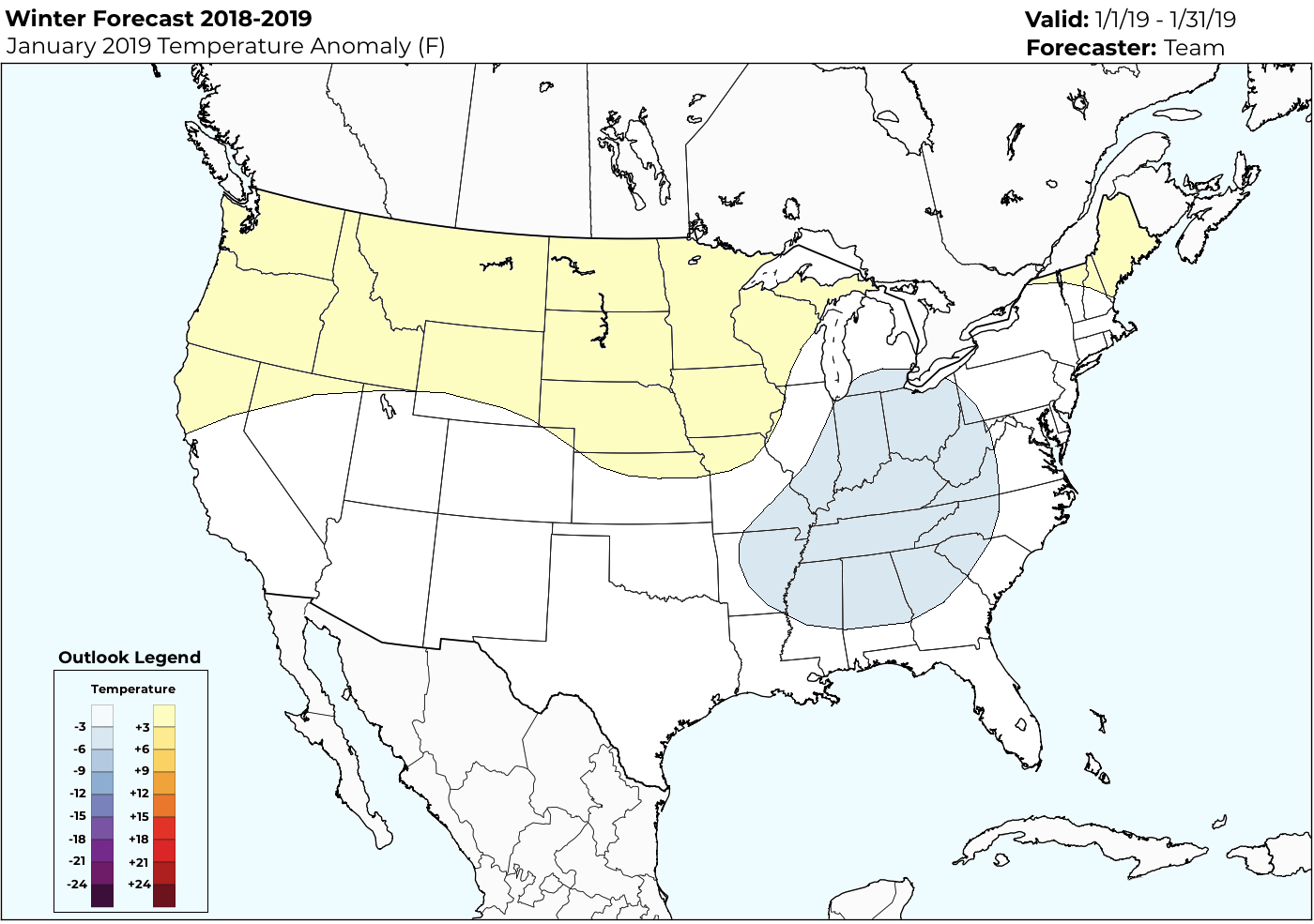 Our current forecast favors a middle of the ground solution, but some guidance and analogs suggest that periods of very anomalous cold could occur – with outbreaks of polar/arctic air across the Central and Eastern part of the country. Regardless, the month looks colder and snowier than normal across the Eastern United States. Precipitation is also expected to average above normal from the Mississippi River Valley into the Ohio Valley, Southeast, Mid Atlantic, and Northeast.