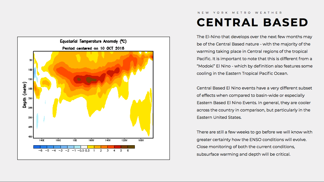 Central Based El Nino events have a very different subset of effects when compared to basin-wide or especially Eastern Based El Nino Events. In general, they are cooler across the country in comparison, but particularly in the Eastern United States. There are still a few weeks to go before we will know with greater certainty how the ENSO conditions will evolve. Close monitoring of both the current conditions, subsurface warming and depth will be critical.