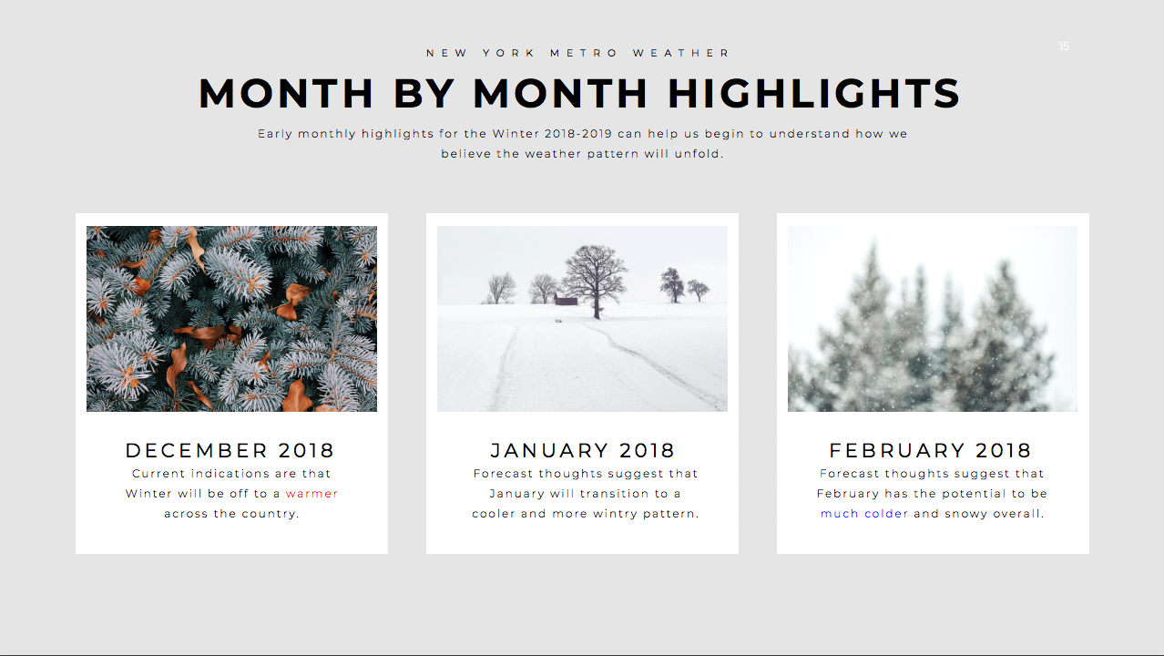 When we take the individual pieces of research and compile them into one organized forecast, we can begin to see the ebbs and flows of the winter ahead – as they should be, according to our very best analogs and subset of current and past conditions. This winter, we are confident in our month-to-month composites and have indicated moderate to high confidence on each month.