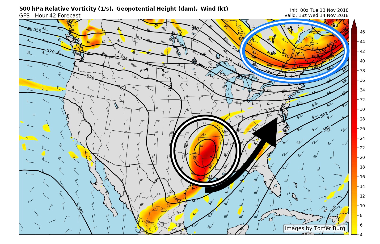 Cold air will be reinforced as the system approaches via a deep trough in Southeast Canada.