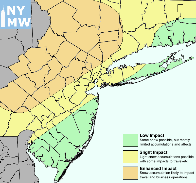 Our forecast currently leans towards the slightly colder solutions, but does allow for some warming and a change to rain during Thursday afternoon. Accordingly, we are suggesting a few inches of snow in the immediate NYC suburbs, the first real snow for NYC Metro but minimal accumulations, and a more significant snowfall event across the Interior.