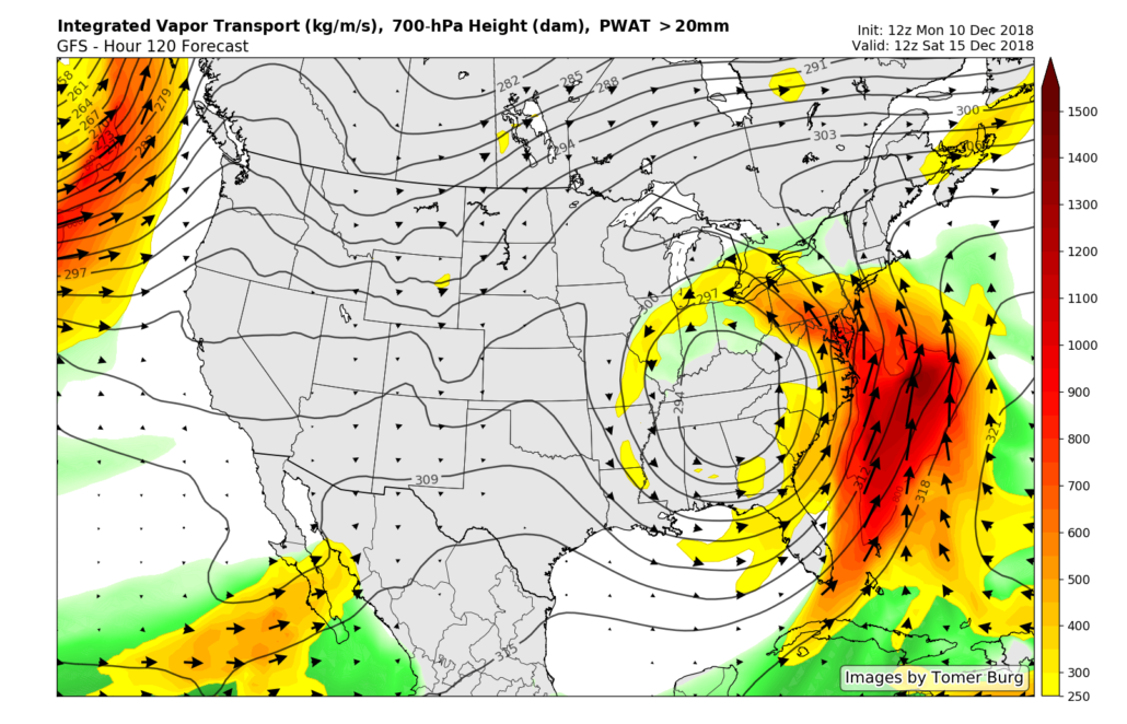 12z ECMWF model showing a very healthy and moist low level jet extending from the Southeast US and into portions of the Northeast (AccuWx Pro)