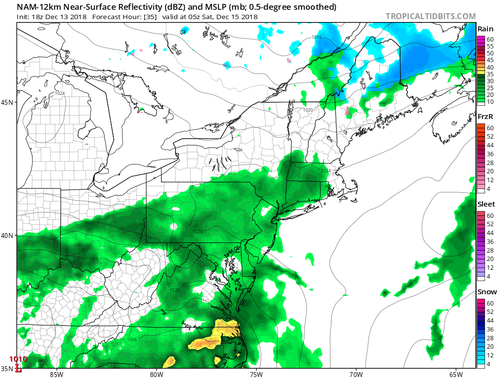 A low pressure area develops into the Ohio Valley later on Friday and is expected to begin to redevelop off the East Coast on Saturday morning. This will allow showers to spread northward through Saturday morning into the Mid-Atlantic and Northeast – although the northward extent of the steady rain is still in question.
