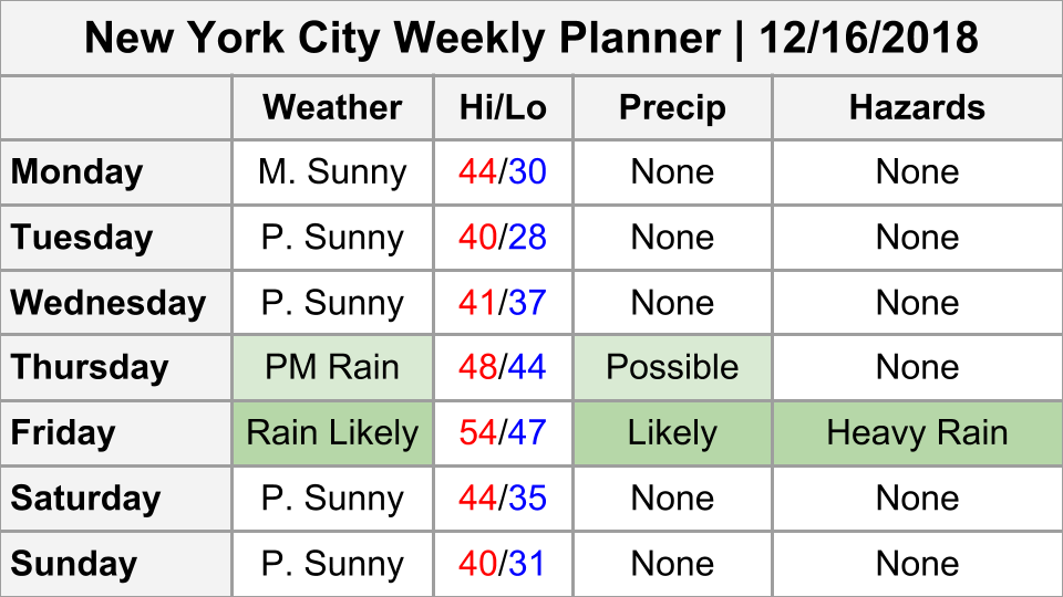 Weekly Weather Rating: Cold to start, but at least it’s dry. Trending milder as the week goes on, with rain likely on Friday. 6/10