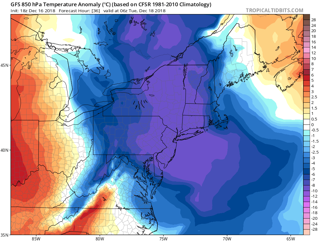 With the departure of the storm system will come a brief shot of anomalous cold. A trough emanating from Canada will slide southward into New England from late tonight through Tuesday, and it will be marked by a cold frontal passage on Monday with the potential for a few snow or rain showers. Still, the main story with the trough itself will be cold air, and temperatures are expected to run a few degrees below normal through Tuesday.