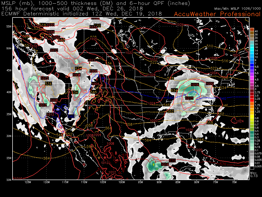 Yet another shortwave trough will possibly be moving through the Ohio Valley and Northeast on Christmas Day. This afternoons model guidance was somewhat more interesting for this feature as they showed the available moisture and dynamics to be a little more impressive than Sun/Mon system. There is an outside chance that this system could produce a swath of light snow over portions of our area on Christmas night, but we will definitely need to revisit this system once Friday’s heavy rain threat is out of the way.