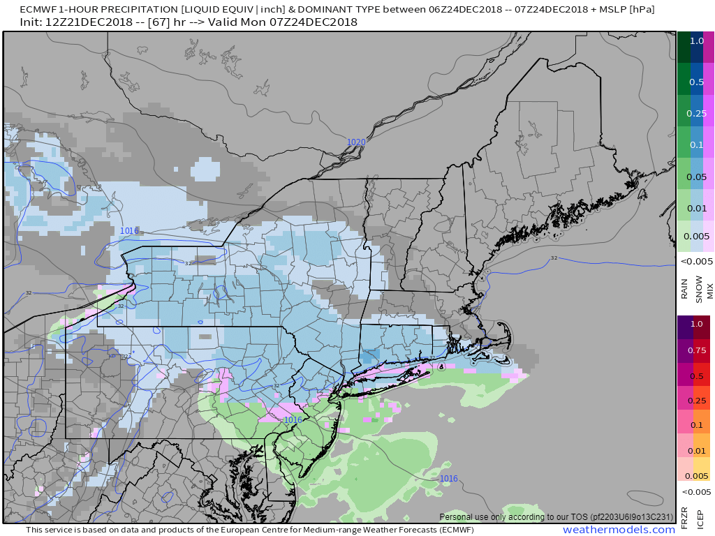 Conditions should be quite pleasant for much of the area on Tuesday (Christmas Day), with mostly sunny conditions and highs in the upper 30’s to lower 40’s expected. Calm and cool conditions should last throughout the entire day, with lows eventually dropping down into the middle to upper 20’s-with coastal locations likely in the lower 30’s. By the time we head into the overnight hours, our attention turns to the Ohio Valley once again. Yet another moisture-starved northern stream shortwave trough will be quickly moving from west to east, possibly causing an area of very light rain and snow showers to develop from west to east Christmas night and into the very early morning hours of Wednesday. Once again, due to the quick-moving nature of this system and the marginal airmass in place, any accumulation potential will be very low for the New York metro area.