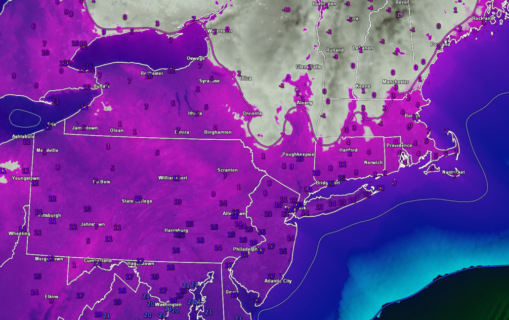 Today has been a brutally cold day across much of the East Coast as an impressive Arctic airmass blasted into the country on Sunday. Additionally, the messy storm system that affected the area this past weekend is now rapidly intensifying off to our northeast. This intensifying system is creating an impressive pressure gradient with the Arctic high pressure currently located over the Ohio Valley. The result has been strong, gusty winds of up to 40 mph creating wind chills anywhere from five to ten degrees below zero across the New York City area today. The extremely dry airmass in place has cleared out virtually any remaining clouds over the Northeast, which made for a classic frigid January day. High temperatures were only able to rise into the teens and single digits across the forecast area, with Central Park getting to around 14F, which is twenty-four degrees below normal!