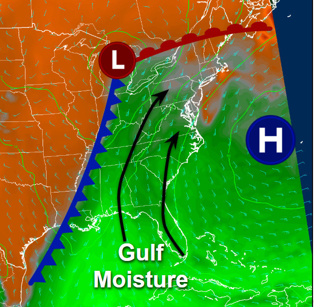 Diagram showing a the setup leading to deep moisture from the Gulf of Mexico overspreading the East Coast