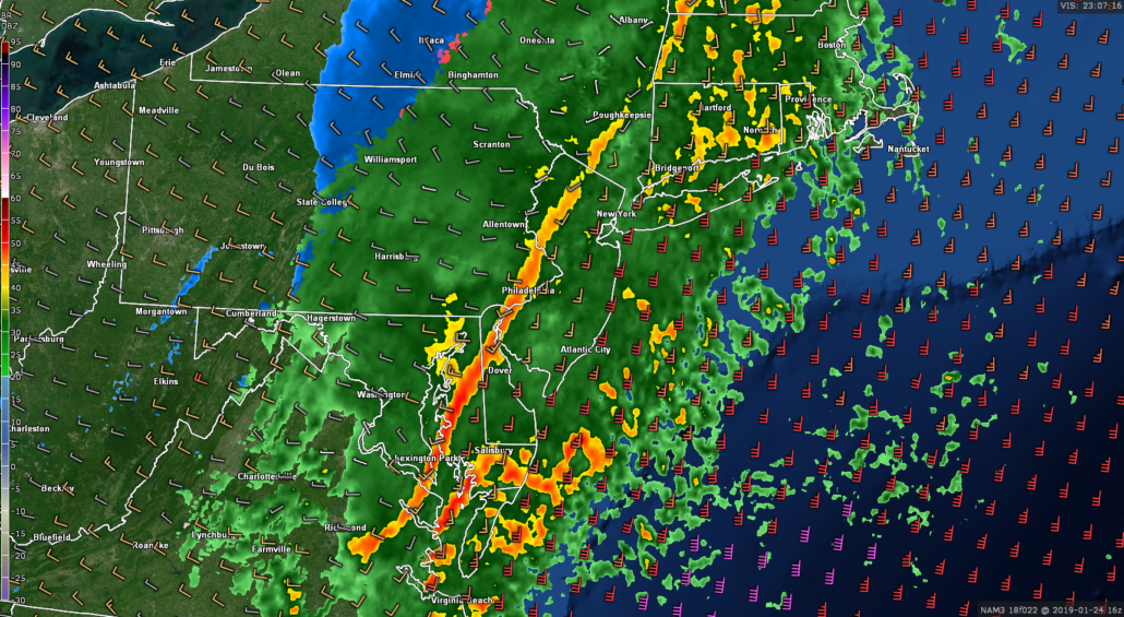 High-resolution model guidance has been consistent in the suggestion that an area of heavy rain associated with an area of low pressure moving along a cold front will be located near the area for the rest of the morning. A strong upper level jet streak will be positioned just off to our north and west. This will provide ample lift for pockets of moderate to occasionally heavy rainfall during the early afternoon hours. In fact, there may even be a line of heavy showers and thunderstorms within this main area of rain that could produce some gusty winds of up to 30-45 mph and flash flooding–especially for locations with poor drainage. Accordingly, the National Weather Service has issued a Flash Flood Watch for the entire NYC metro area through 6 pm.