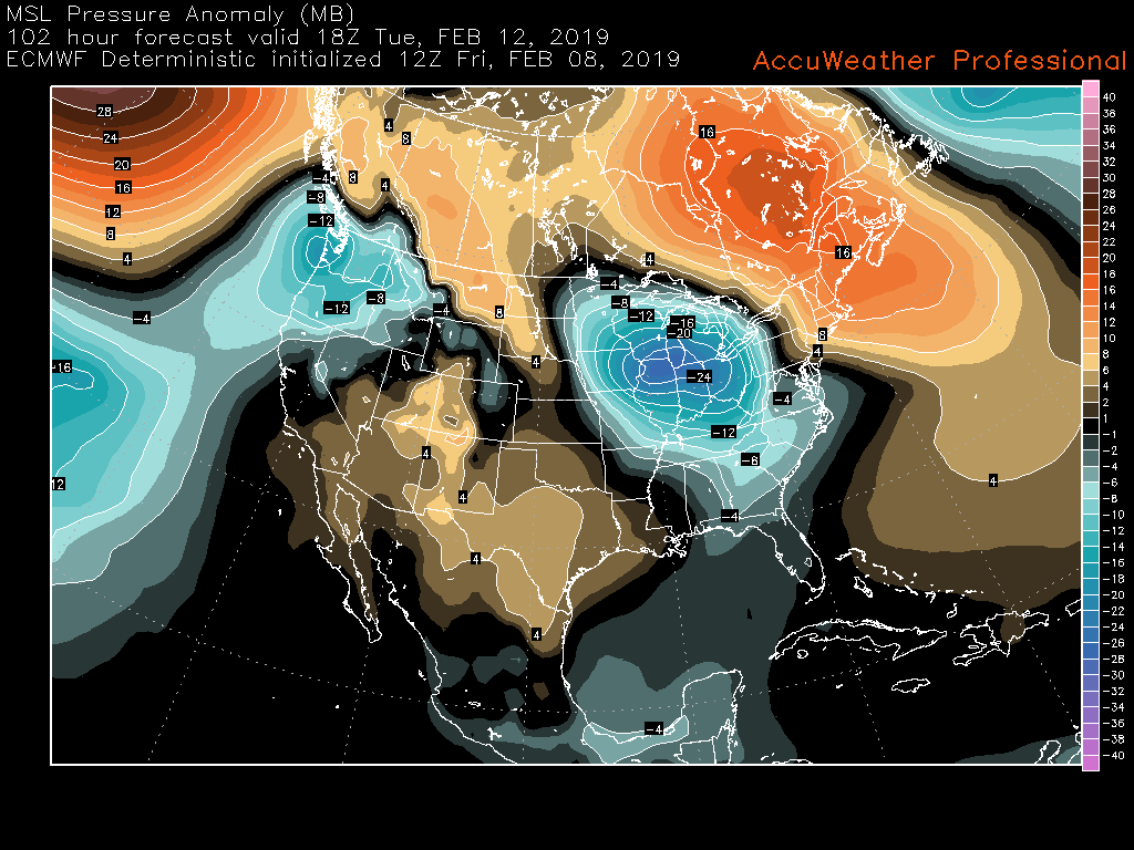 ECMWF model showing the surface setup on Tuesday AM. Blue areas represent lower pressures, with the warmer colors representing higher areas of pressure