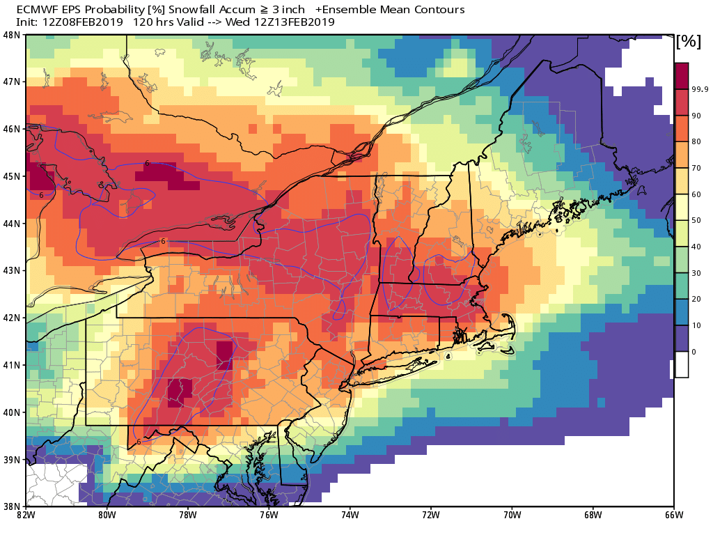 This afternoon’s European ensembles showing a high potential for 3″ or more of snow by Tuesday morning across the NYC area