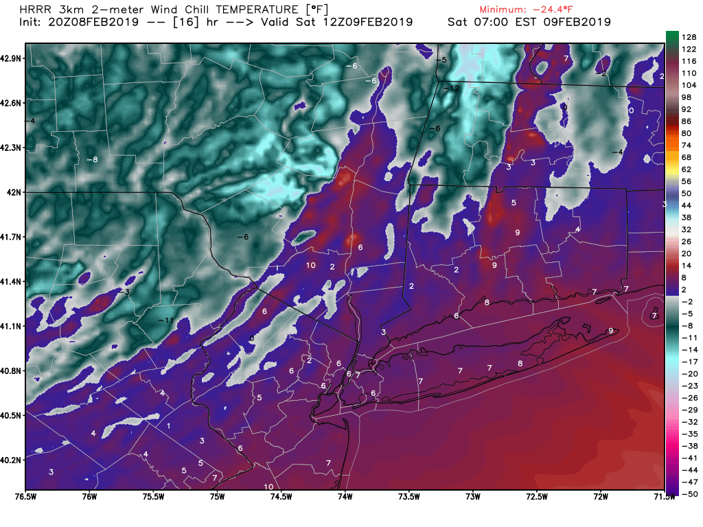 HRRR model showing wind chill values close to zero for much of the NYC area by early Saturday morning