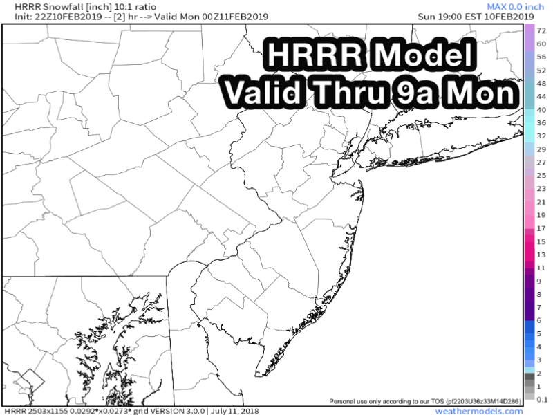 The story begins with a weak disturbance, which is set to pass to the south of NYC on Sunday Night. Just enough lift in the atmosphere and cold temperatures suggest snow will break out across Southern and Eastern Pennsylvania. While the atmosphere remains dry to start, it will moisten up by Monday morning, and support snow. This snow will gradually shift eastward into Central and Southern New Jersey.