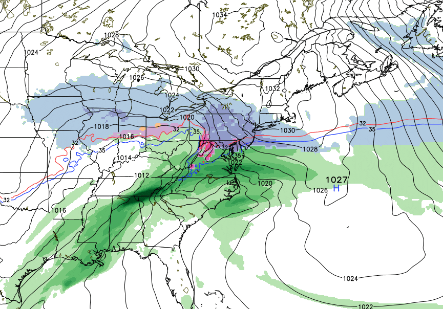 A relatively strong area of high pressure moves into the Plains and the Ohio Valley on Monday and Tuesday, sending another reinforcement of cold and dry conditions into the East. Highs on Monday and Tuesday will likely struggle to break out of the 30’s, with low temperatures falling into the lower 20’s for both days. At the same time, a large and deep trough originating from the Pacific will begin to dig into the Western US Tuesday night. As this trough continues to dig in over the Rockies, deep tropical moisture originating from the Western Caribbean will overspread much of the Southeast by early Wednesday morning. This will create a large area of moderate to heavy precipitation developing from the Southeastern states to the Mid Atlantic as high pressure continues to remain anchored in over the Northeast.