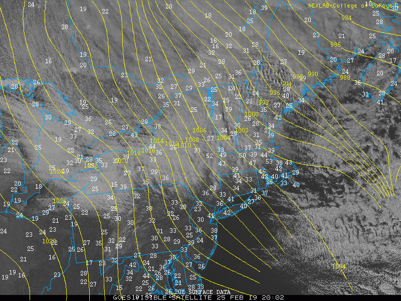 Visible satellite imagery this afternoon along with wind gusts (mph) across the Northeast this evening