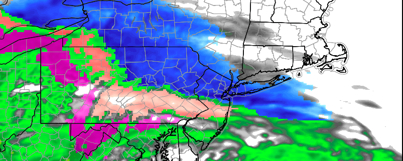 The story begins with a weak disturbance, which is set to pass to the south of NYC on Sunday Night. Just enough lift in the atmosphere and cold temperatures suggest snow will break out across Southern and Eastern Pennsylvania. While the atmosphere remains dry to start, it will moisten up by Monday morning, and support snow. This snow will gradually shift eastward into Central and Southern New Jersey.