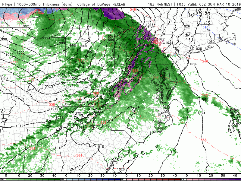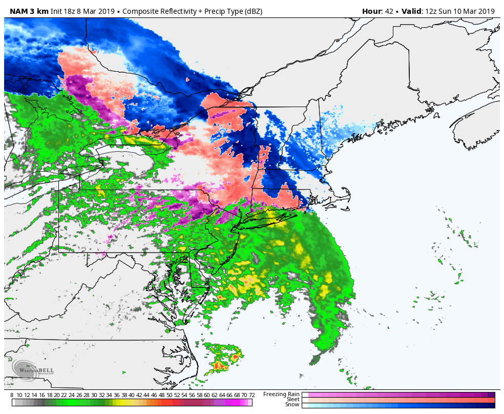 3km NAM showing the potential for some areas of mixing mainly off to the north and west of the city on Sunday morning before switching to rain