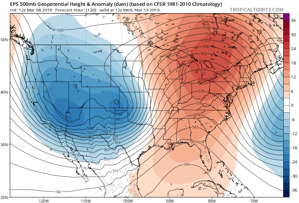 ECMWF Ensembles valid next week showing a large, deep trough over the West and a deep ridge over the East. Such a pattern would increase the potential for storms cutting off to our west, with some increased temperatures later in the week