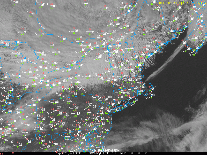 This evening’s high resolution visible satellite imagery showing mainly clear and breezy conditions over the Northeast
