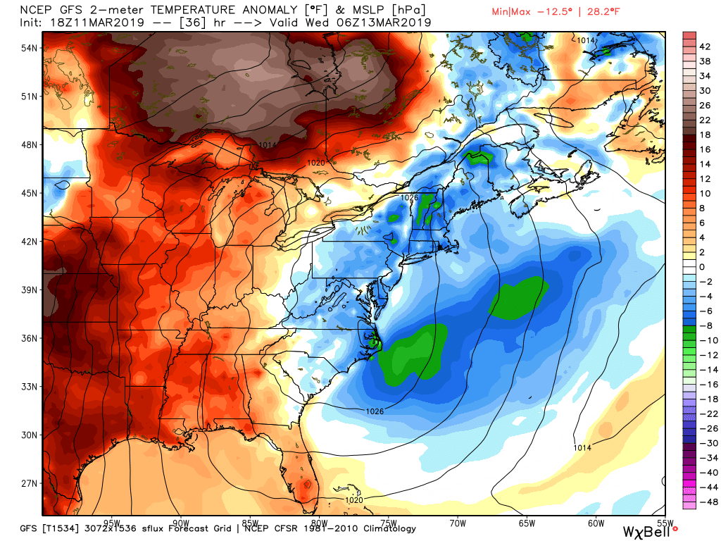 This evening’s GFS model showing below normal temperatures into Tuesday night/Wednesday morning as high pressure moves through the East.