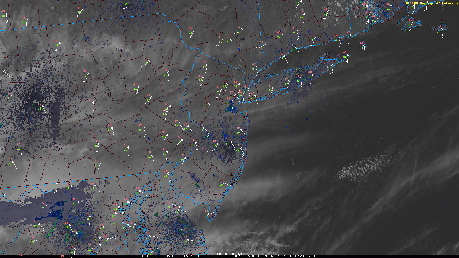 This evening’s latest high resolution visible satellite imagery along with surface observations showing a rather calm conditions across the NYC area