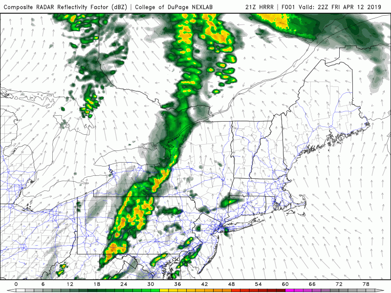 This evening’s HRRR model showing heavy showers and possibly some embedded thunderstorms moving into the area after midnight