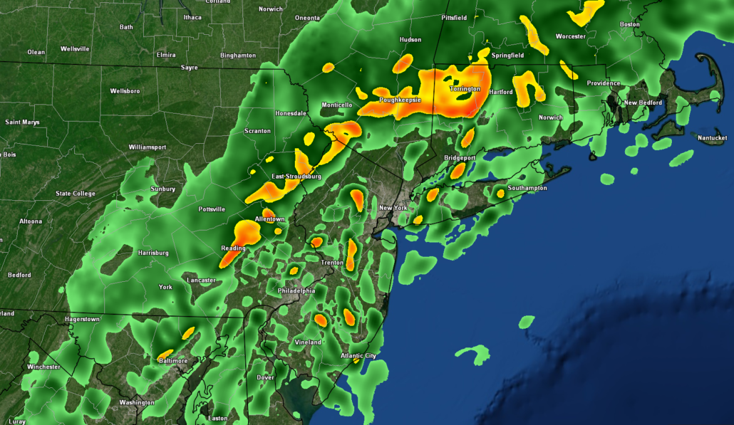 A warm front is currently moving across the area, with some occasional light showers and drizzle. Additionally, temps have also risen a few degrees into the middle to upper 60’s with the frontal passage. Much of the same is expected into the late evening with periods of light rain and drizzle moving through the area. An impressive moisture feed with ties to the Gulf of Mexico should move into the Northeast later tonight as the frontal system sits just off to our east. This will likely promote the development of areas of moderate to heavy rain right around midnight.