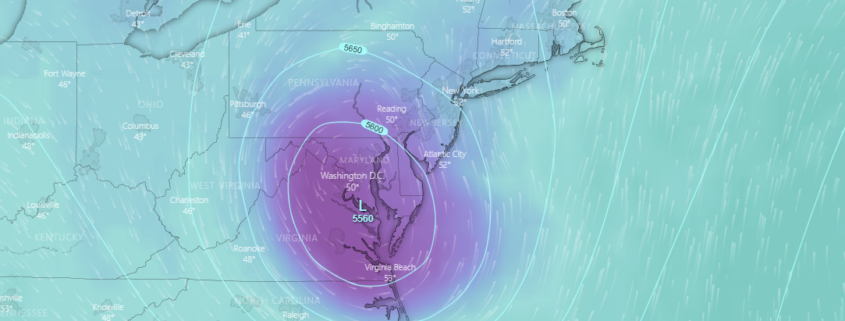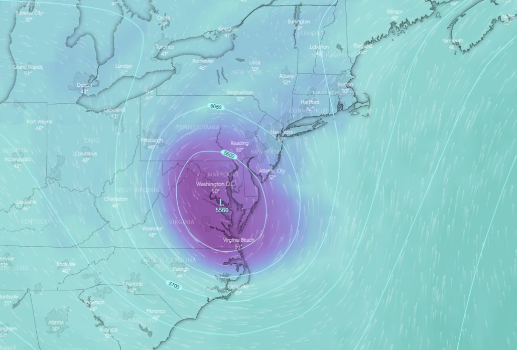 This evening’s GFS model showing the upper level low lingering over the Northeast during the day on Sunday