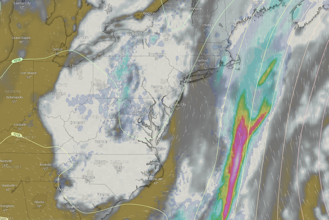 Unfortunately, things look to go downhill around 9pm or so for much of the NYC area. Residual thunderstorm activity and increased areas of lift will close in–likely resulting in overall rain coverage expanding. Pockets of moderate to heavy rainfall will gradually move from south to north for the majority of the night, with a risk of flash flooding (mainly for areas with poor drainage). Lows tonight will will be notably mild and muggy, with upper 50’s to lower 60’s likely!