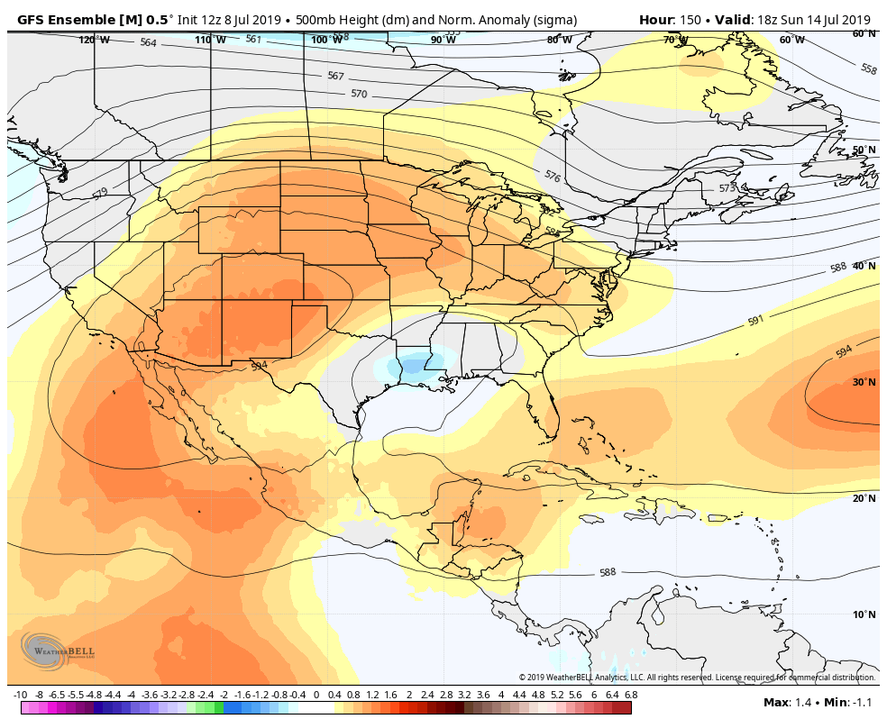 This evening’s GFS ensembles showing the beginning of a potentially hot period of weather shaping up for the Eastern US