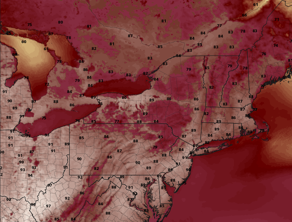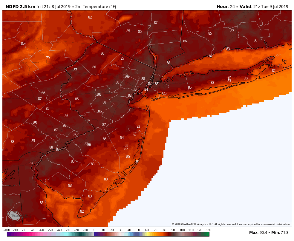 NWS forecasted highs for Tuesday. Some locations over portions of NE NJ could easily break that 90-degree mark!