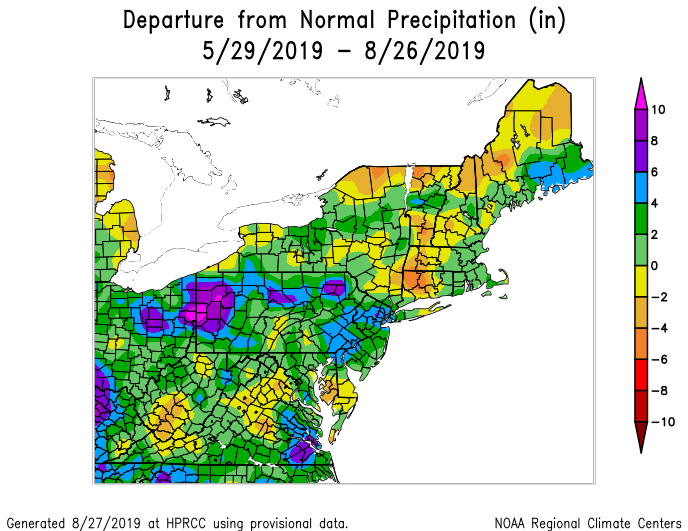 New York City will finish meteorological summer with above normal temperatures and above normal precipitation when the unofficial season ends on August 31st. Temperatures from June 1st through August 27th averaged 1 to 3 degrees above normal throughout the New York City Metro, while precipitation ended 3 to 6 inches above average. Official numbers will be released by the National Weather Service next week.