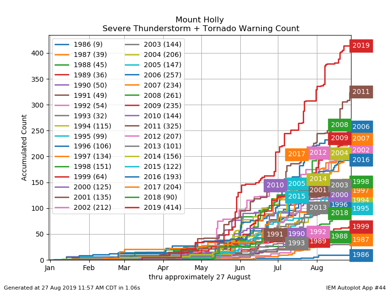 Thunderstorm events were frequent in the New York City metro area and New Jersey during the meteorological summer. Through August 27th, the National Weather Service in Mount Holly, NJ has issued over 400 Severe Thunderstorm and Tornado Warnings in 2019 – leading all other years since 1986 by a wide margin.