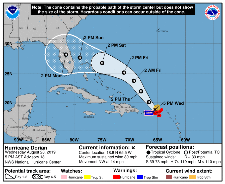 Hurricane Dorian has continued to gradually strengthen this afternoon. The storm traversed the US Virgin Islands today, just 24 hours after making a sudden jog to the north near the Lesser Antilles. Maximum sustained winds have increased to 80 miles per hour per the latest advisory from the National Hurricane Center, and further strengthening is expected in the coming days. By this weekend, Dorian is expected to be a powerful hurricane approaching Florida.