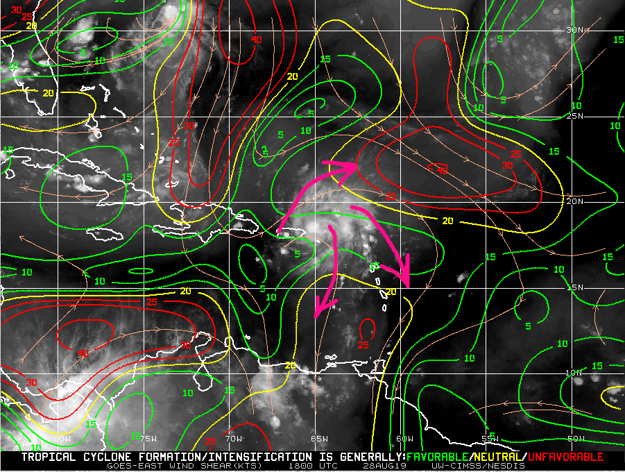 Additionally, the aforementioned upper-level environment may allow Dorian to “pump the ridge” to it’s north a bit. This phenomenon occurs when strong hurricanes with equally strong poleward outflow channels are positioned just to the south of a growing ridge. The air expended from the core of the hurricane can help act to strengthen the ridge to it’s north, steering the storm more to the west or west-southwest. This was seen with some of the more intense/further north ECMWF ensemble members this afternoon.
