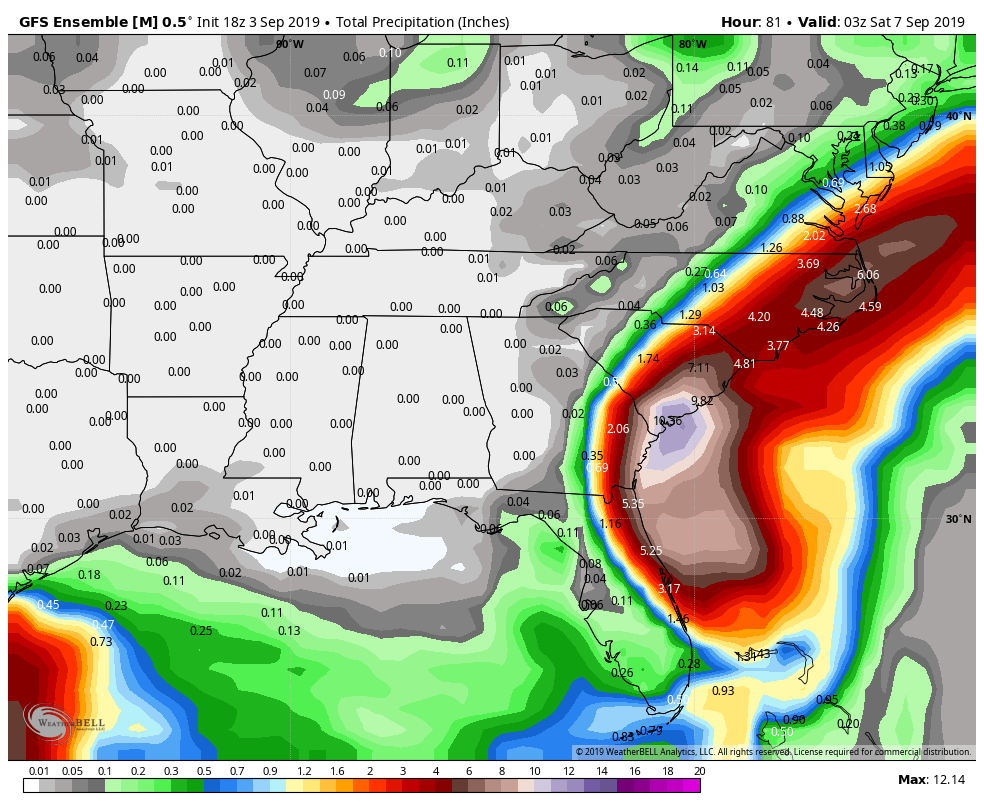 In addition to wind and storm surge, the potential for torrential and flooding rainfall appears to be significant. The upper levels of the atmosphere will become more favorable for precipitation to expand away from the storms center, and surface convergence and lift could allow bands of torrential rain to sit over the same areas for many hours. The GFS and ECMWF ensemble means are both indicating the potential for more than 10″ of rain in less than 24 hours in parts of South Carolina.