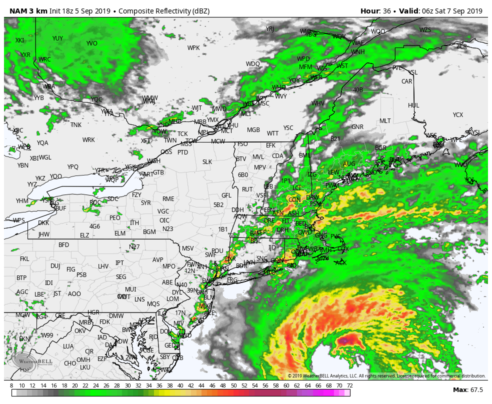 Before the post tropical transition occurs, Dorian will slide just to the east of the Mid-Atlantic and New England coastlines. While direct impacts from wind and rain are not expected, high surf and dangerous rip tides are likely at area beaches. As a result, New York City announced today that they are closing area beaches to swimmers through Saturday evening.