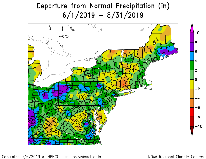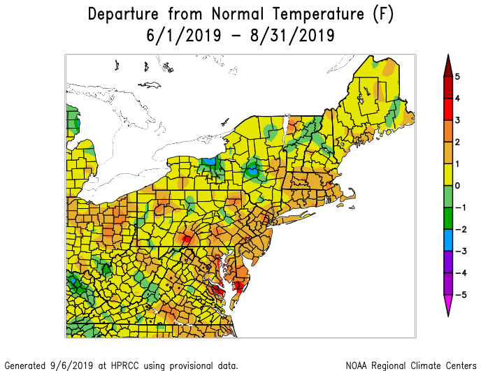 The Summer of 2019 was warmer and wetter than normal throughout a large majority of the Northeast states. The last few months in particular have been several degrees above average, and have featured a high volume of rainfall events.