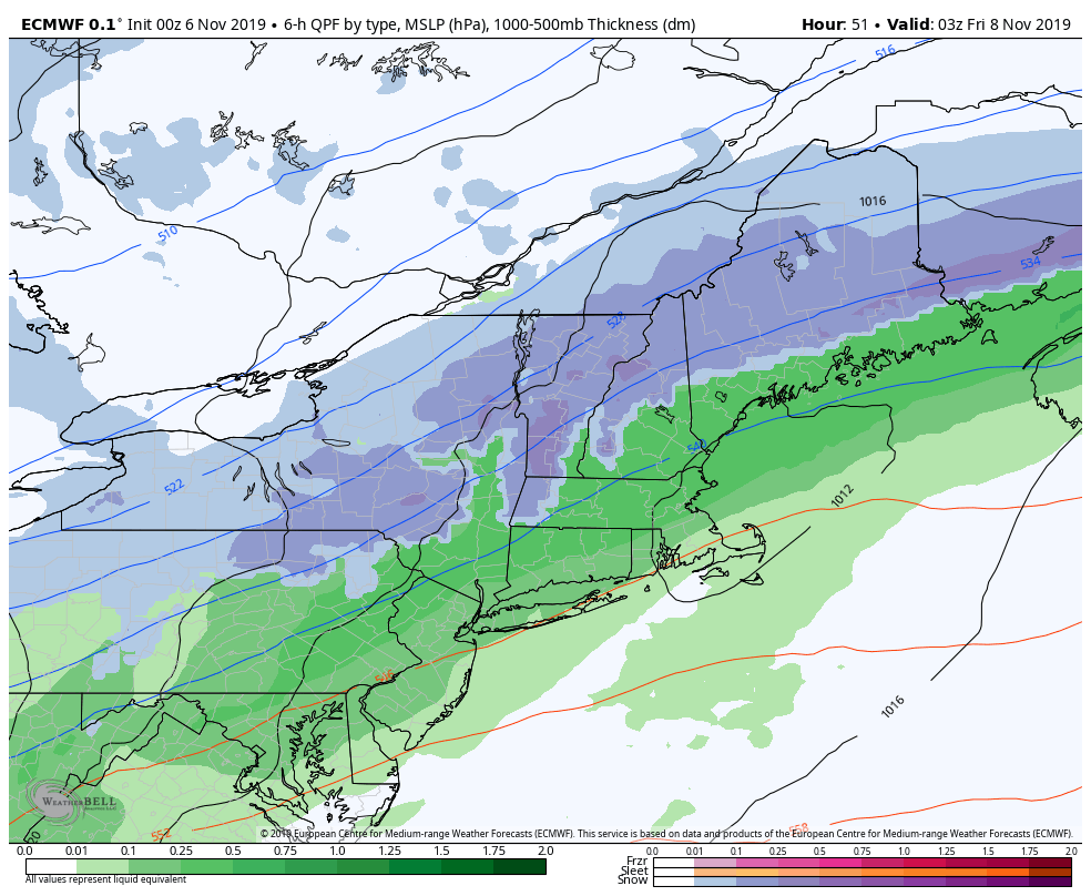 Things start to get busy later this week. A low pressure system develops along a frontal boundary on Thursday, with showers expected to develop throughout the Northeast states. Early in the week, some model data indicated that low pressure would be tracking to the south of our area and pulling more cold air in from the north, which would of resulted in more wintry precipitation in our area. This was always unlikely – and accordingly, models have trended northward, keeping wintry weather relegated to Northern New England.
