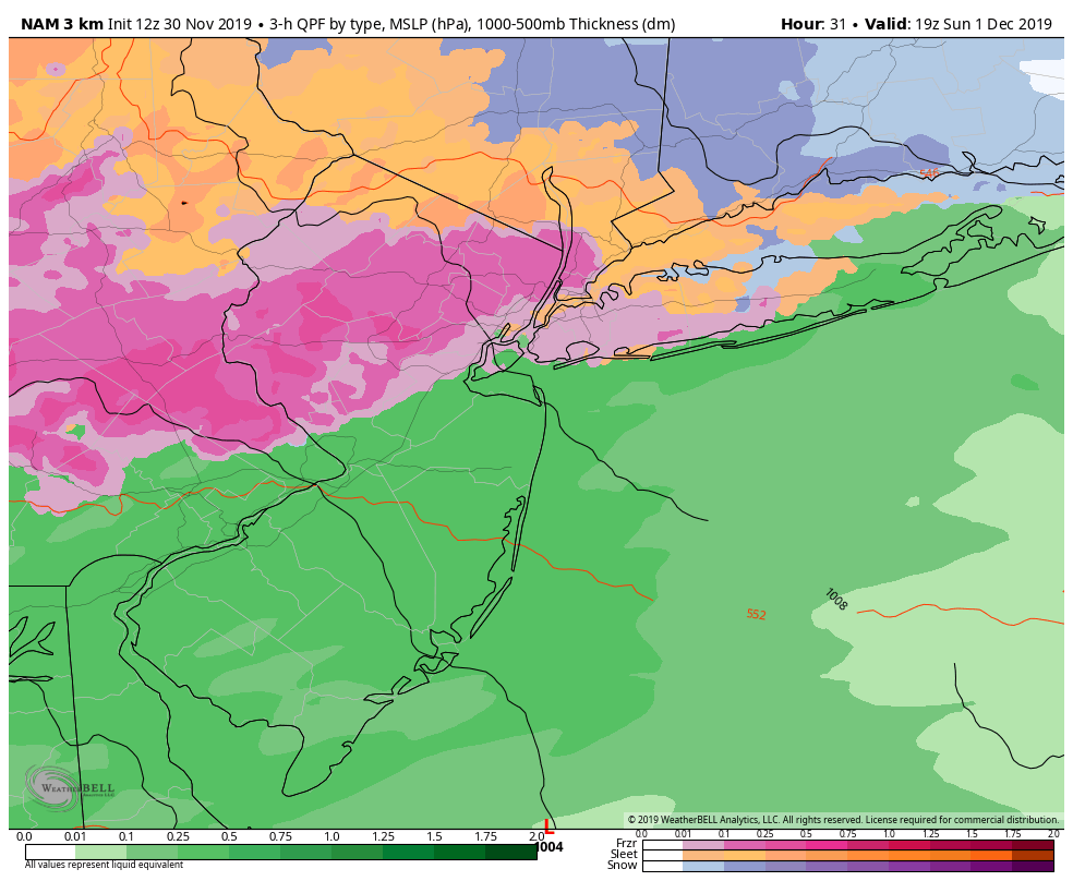 A band of precipitation, associated with the main surface low over the Great Lakes, will move into Pennsylvania and New Jersey on Sunday. Precipitation should begin as snow during the late morning and early afternoon. As time goes on, a mid level warm layer is expected to expand. This will melt snowflakes as they fall toward the ground, changing the observed precipitation type to sleet or freezing rain. Eventually precipitation will change to all rain by Sunday evening in most of NJ and the NYC Metro