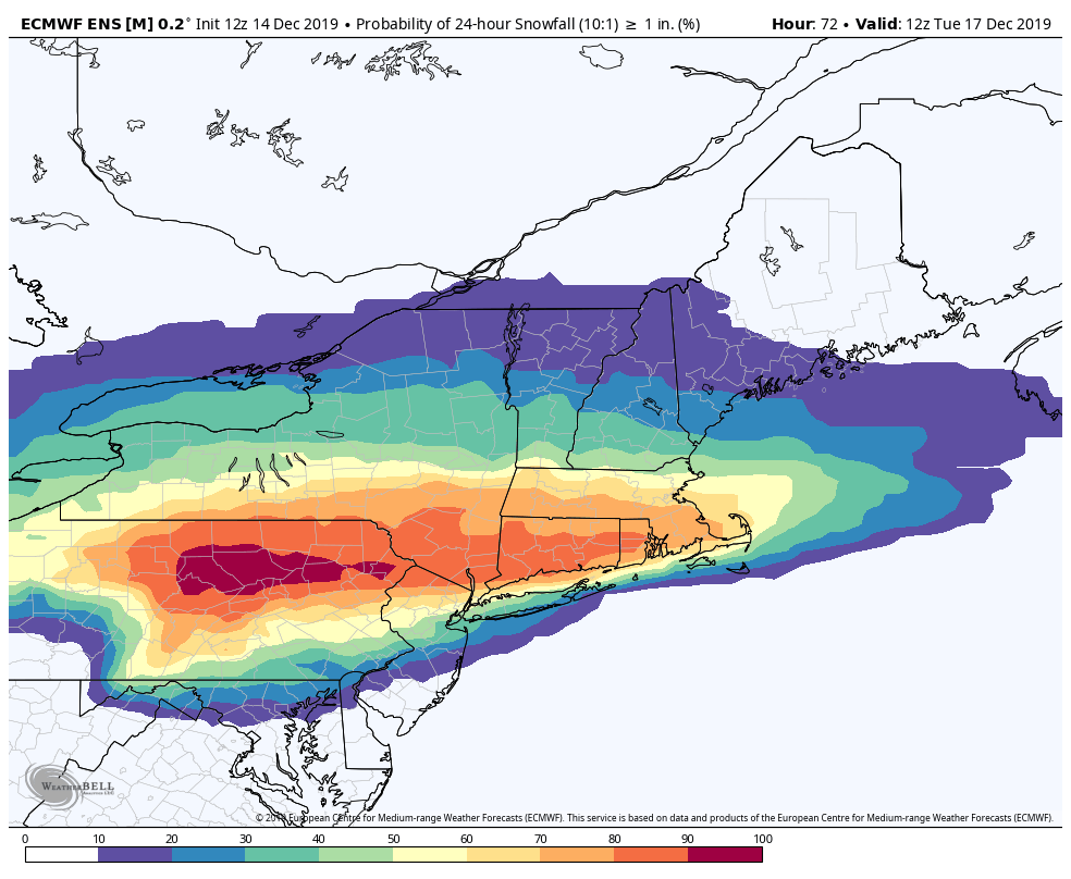 A few forecast models are suggesting the potential for a heavier band of snow associated with warm air advection and focused along a frontal boundary on Monday. This could lead to dynamic cooling, where heavy precipitation rates cool the atmosphere and allow snow to fall. If this does occur, a band of 1-3″ of snow would be possible from Eastern PA into parts of New Jersey.